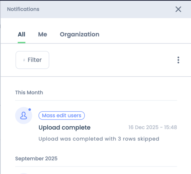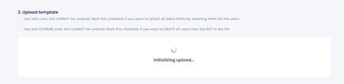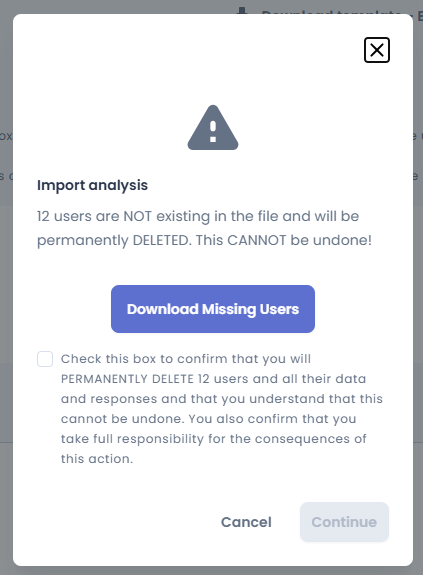 The "Download Missing Users" button will result in a new CSV file that contains a list of the users that will be deleted if proceeding with the upload. You have to check the informational checkbox in order to be able to proceed with the upload.